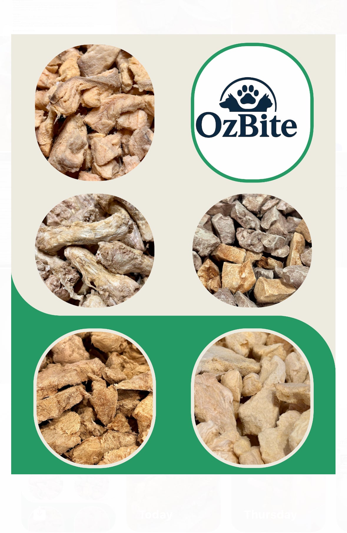 OzBite was born from a simple belief: pets deserve treats that are just as natural and wholesome as the food we’d put on our own table. That’s why every single OzBite product is proudly 100% Australian sourced and made, using only premium cuts of meat from trusted local farmers. We use gentle freeze-drying technology to lock in all the nutrients, flavour, and aroma that pets love – without adding anything artificial. The result? Light, crunchy treats that are high in protein, low in fat, and completely natural, each bite delivers pure goodness and tail-wagging happiness. At OzBite, we’re more than a pet treat brand – we’re a promise of quality, honesty, and care. Every pouch is packed with love for your dogs and cats, because healthy pets are happy pets.